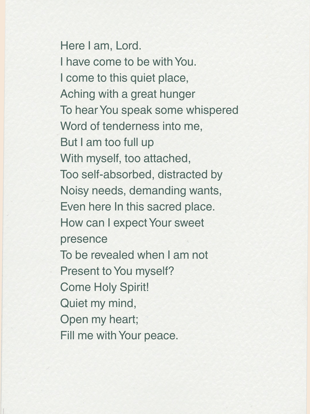 In order to do this, we can make a special place in our homes, a kind of sacred space, where we can take ourselves apart for a few minutes each day and make time for God. It should be a place for quiet, focused time for God. This is not easy, to be sure, because distractions have a way of getting in the way of the process. I know from my own experience how hard it can be, but God knows our innermost being. He knows when our hearts and minds have turned to him, and he is always ready to respond instantaneously. Prayer is a desire for a relationship, and that’s what God is all about. This is a poem I wrote about my own experience relating to the hard work of prayer and the role of patient endurance in the face of distractions. It is all about attitude.