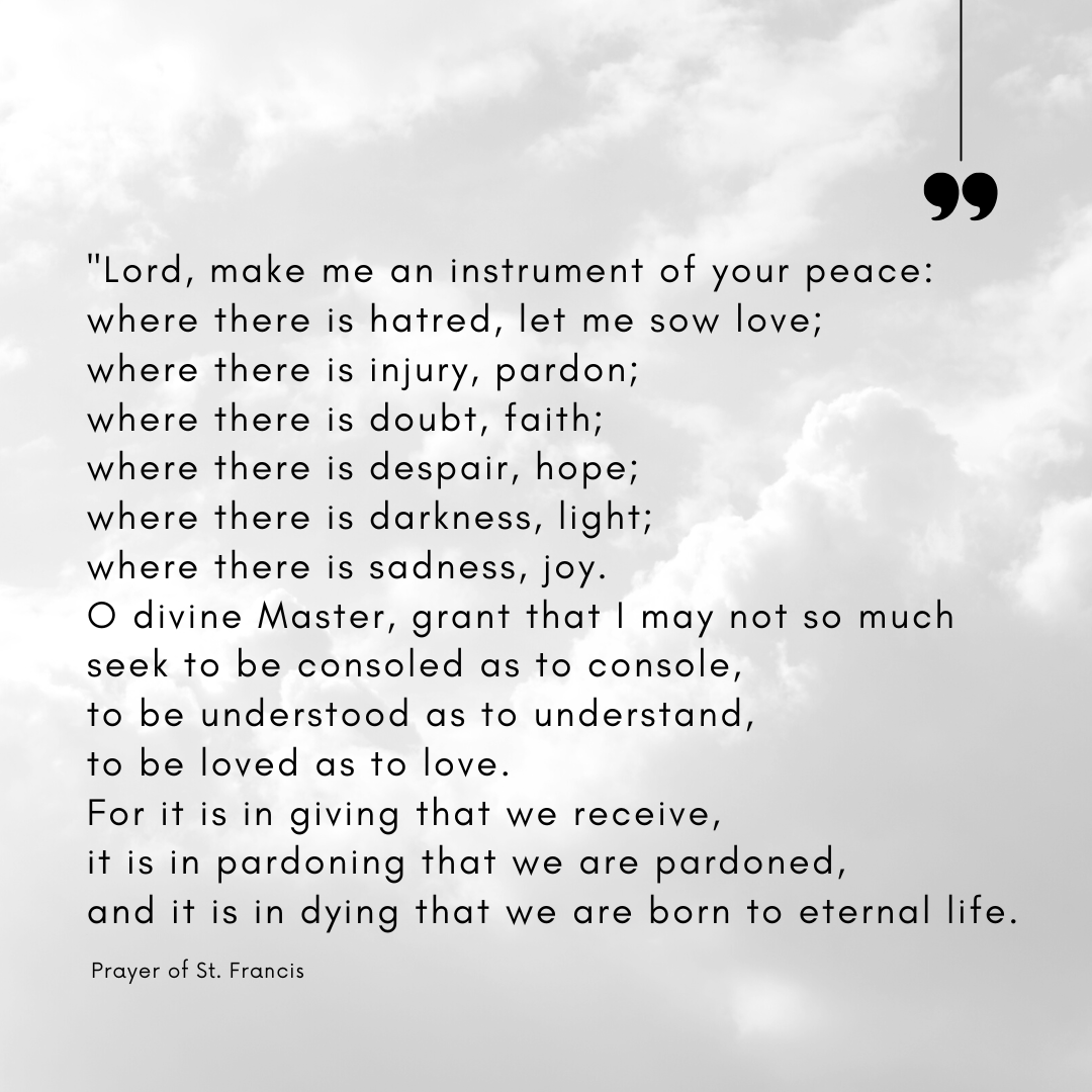 In these increasingly troubled times, abroad and here at home, it is imperative that there is a great need for each of us individually, and all of us collectively, to refocus our minds and hearts. We are in danger of succumbing to the dominant feelings of the moment, of falling into the patterns of darkness that lead us nowhere worthy of human beings made in the image and likeness of the Creator. Our hearts and minds cry out for peace, a peace that no human being or institution can bring about. With that in mind, I am moved to share a prayer that is quite familiar to most. If not, this thoughtful, beautiful prayer has its own power to focus the mind and to point the heart into ways more suited to our better angels. It is sometimes called the Prayer of St. Francis.